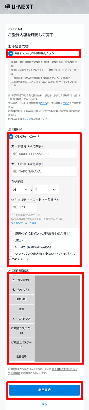 3.氏名、メールアドレス、クレジットカード情報などを入力して完了。
